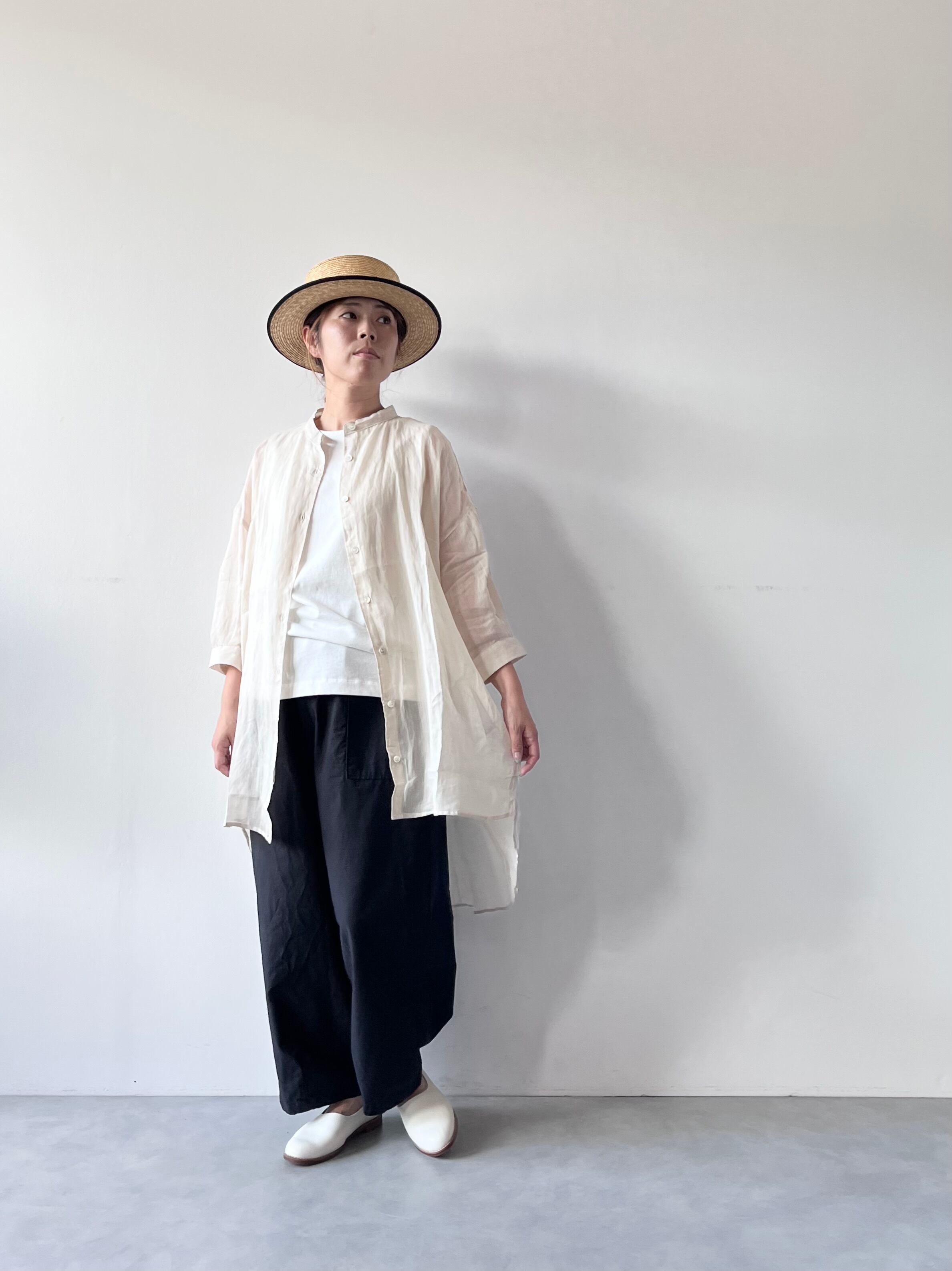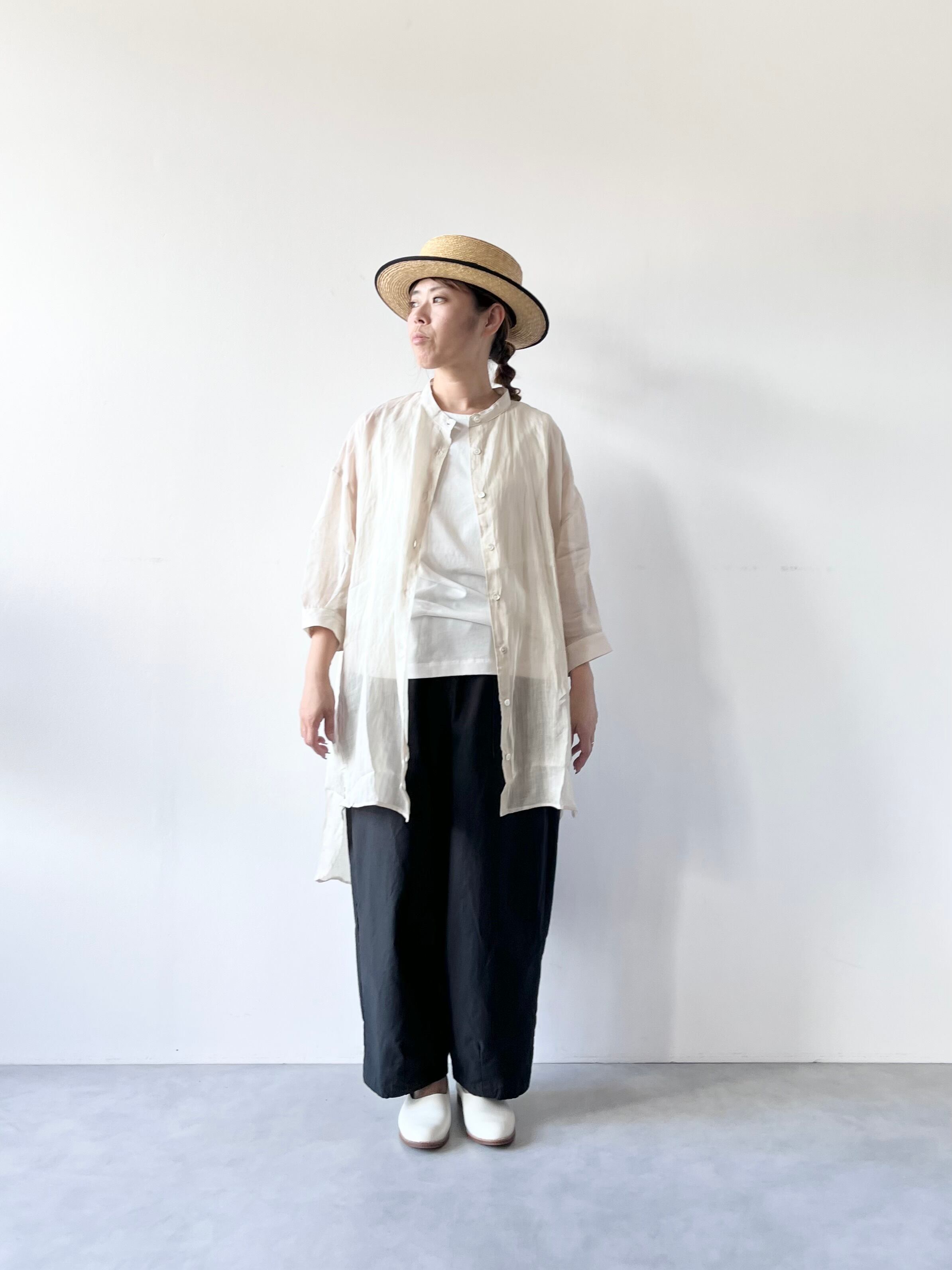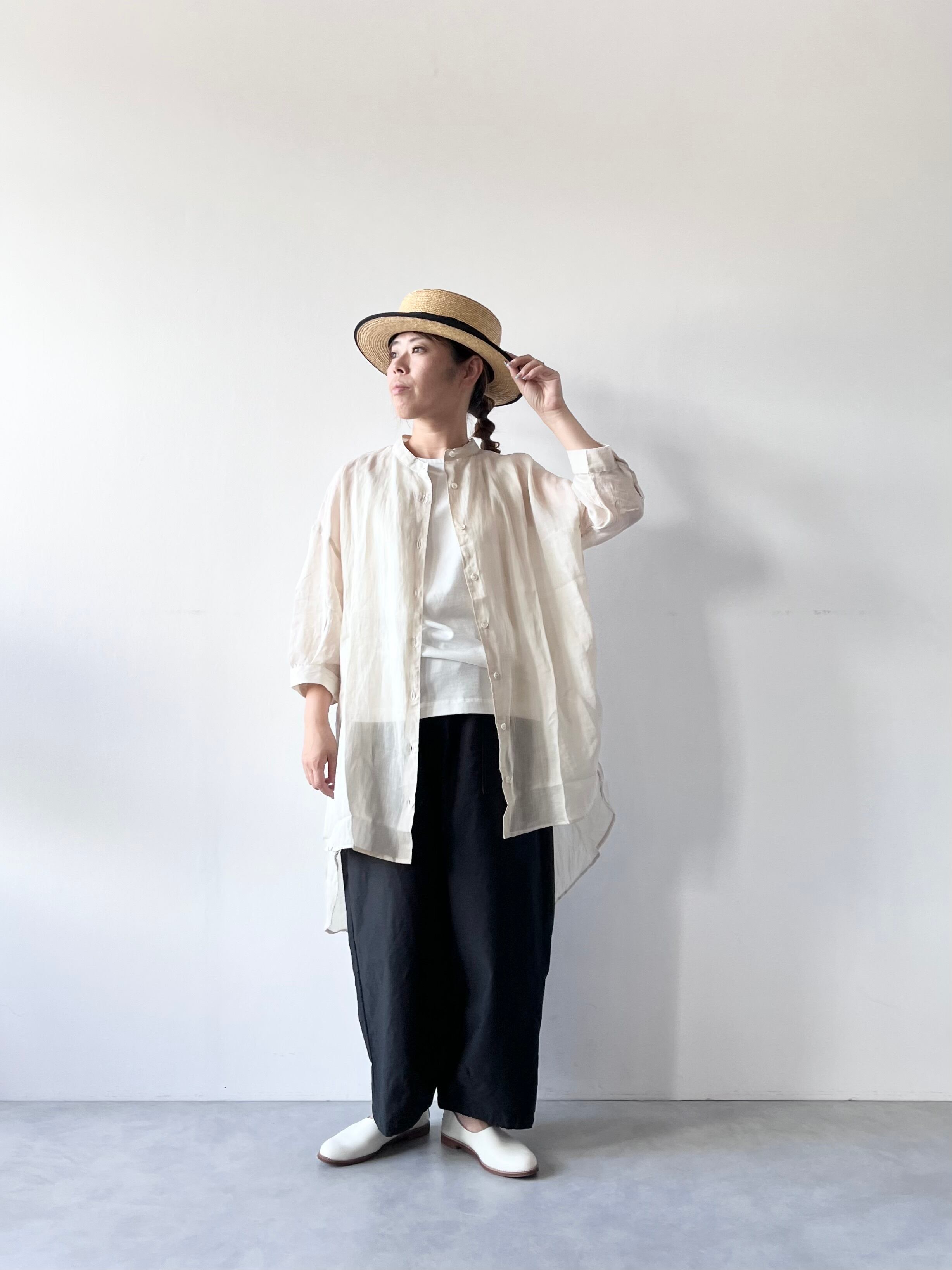 薄手で少し透け感のある素材が涼し気で、タンクトップなどをインナーに羽織りのスタイルの着こなしも◎