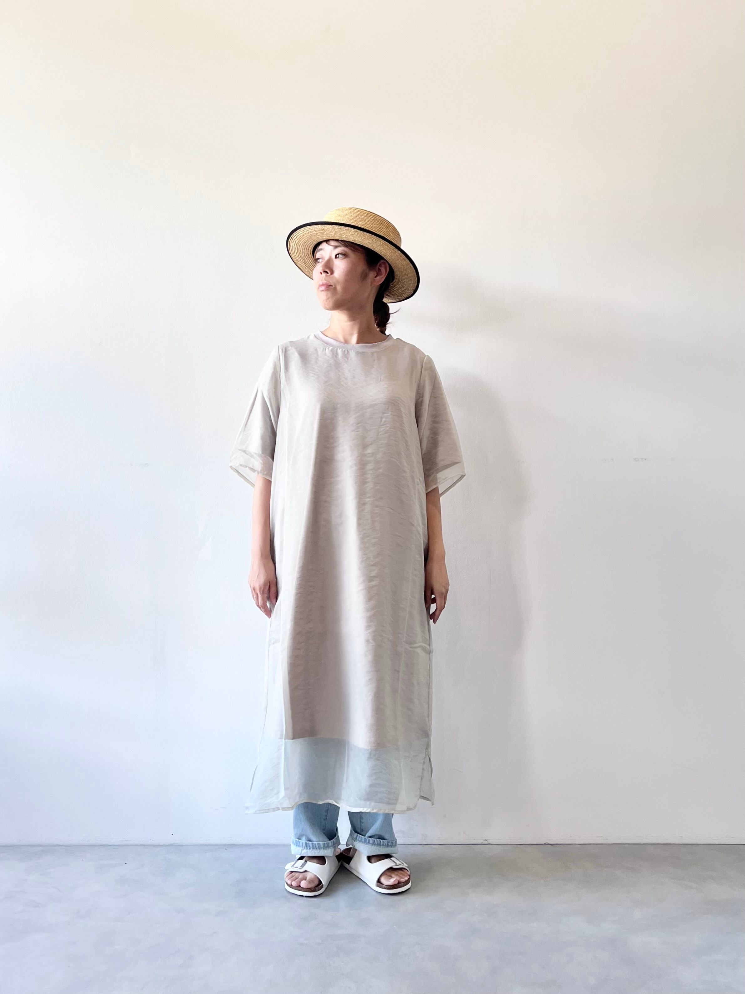 肌あたりの良いカットソーに程よい透け感のあるオーガンジーをレイヤードしたワンピース。