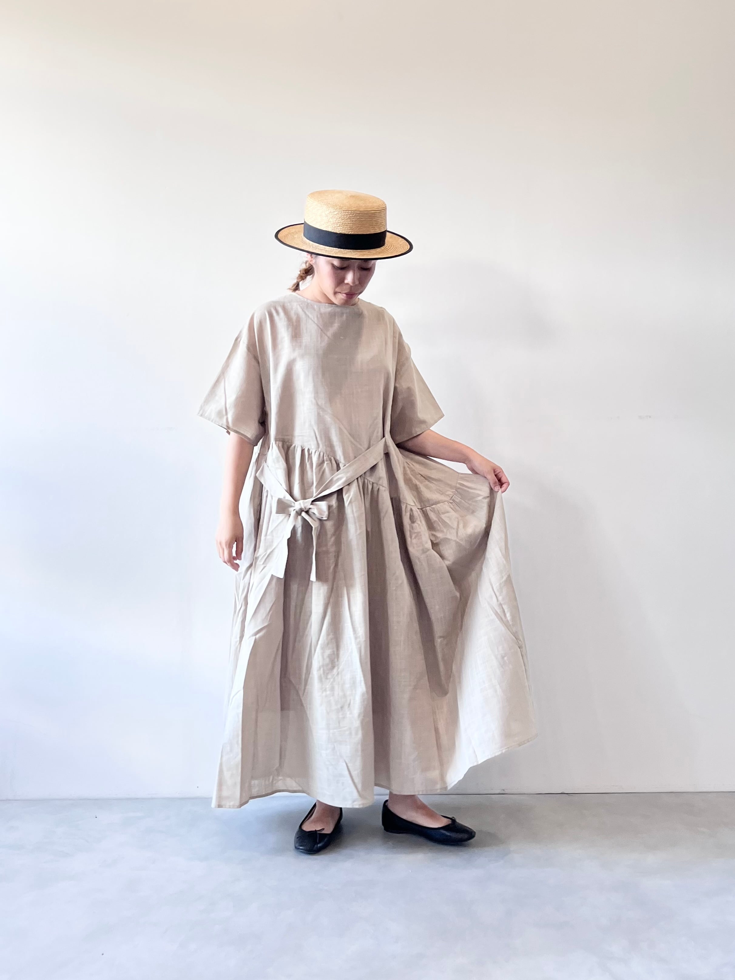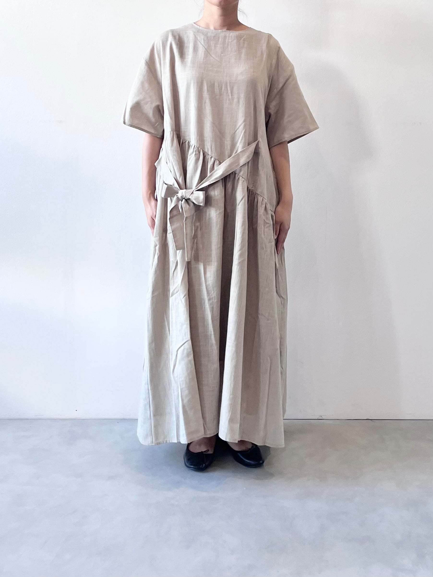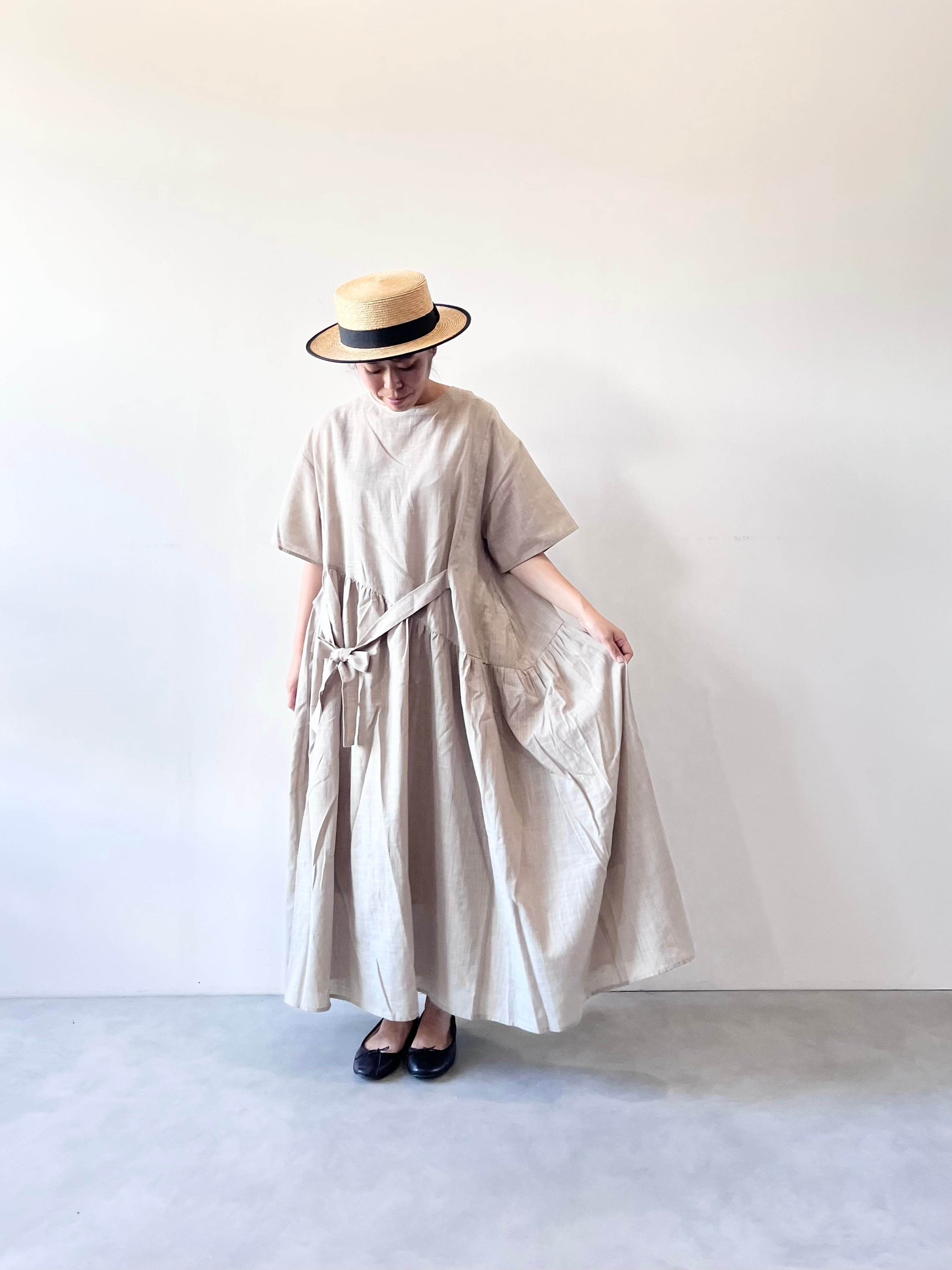ウエストのリボンを結ぶと左身頃にタックが入ったように見えたり、サイドポケットにリボンをしまってリラックスして着用出来たりと、シルエット変化を楽しめます。