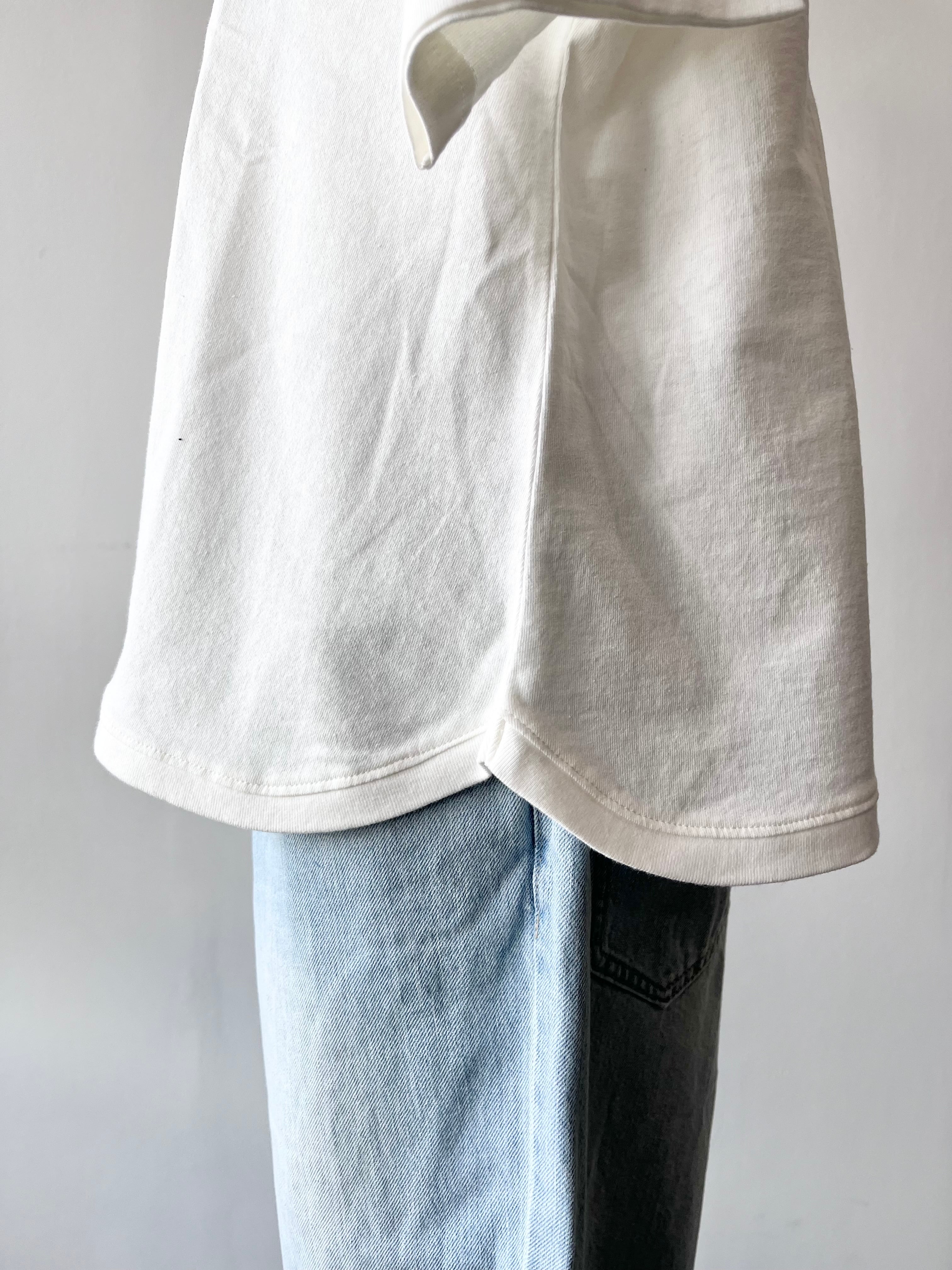 程よくしっかりとしたアメリカンドライ天竺のシンプルなプルオーバーです。 裾に向かってAラインのシルエットでラウンドしたスリットもシンプルながらもかわいいポイント◎ ゆったり目の身幅で着心地も良く、どんなボトムスとも合わせやすい一枚です。 素材:綿100% サイズ:身幅54cm 着丈59cm 肩幅43cm 天幅14cm 袖丈18cm 袖口幅16cm 裾幅64cm