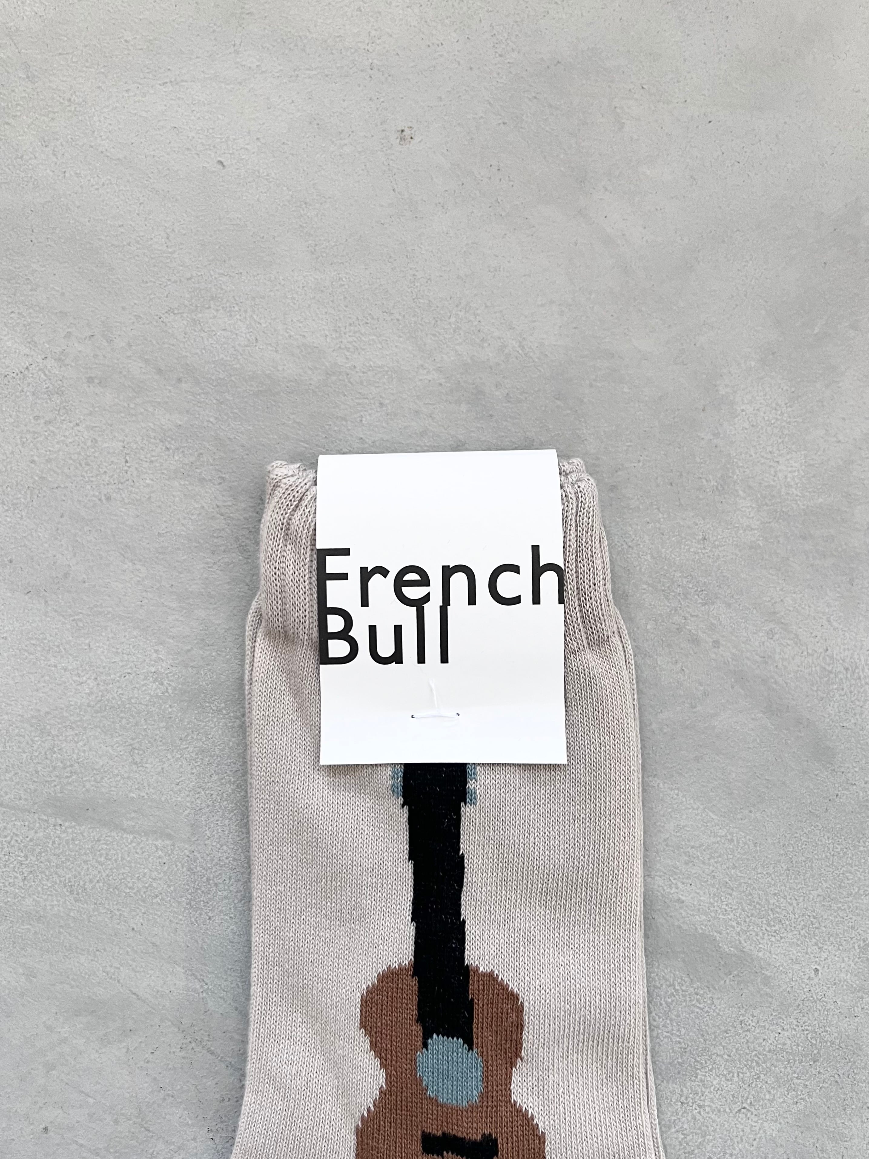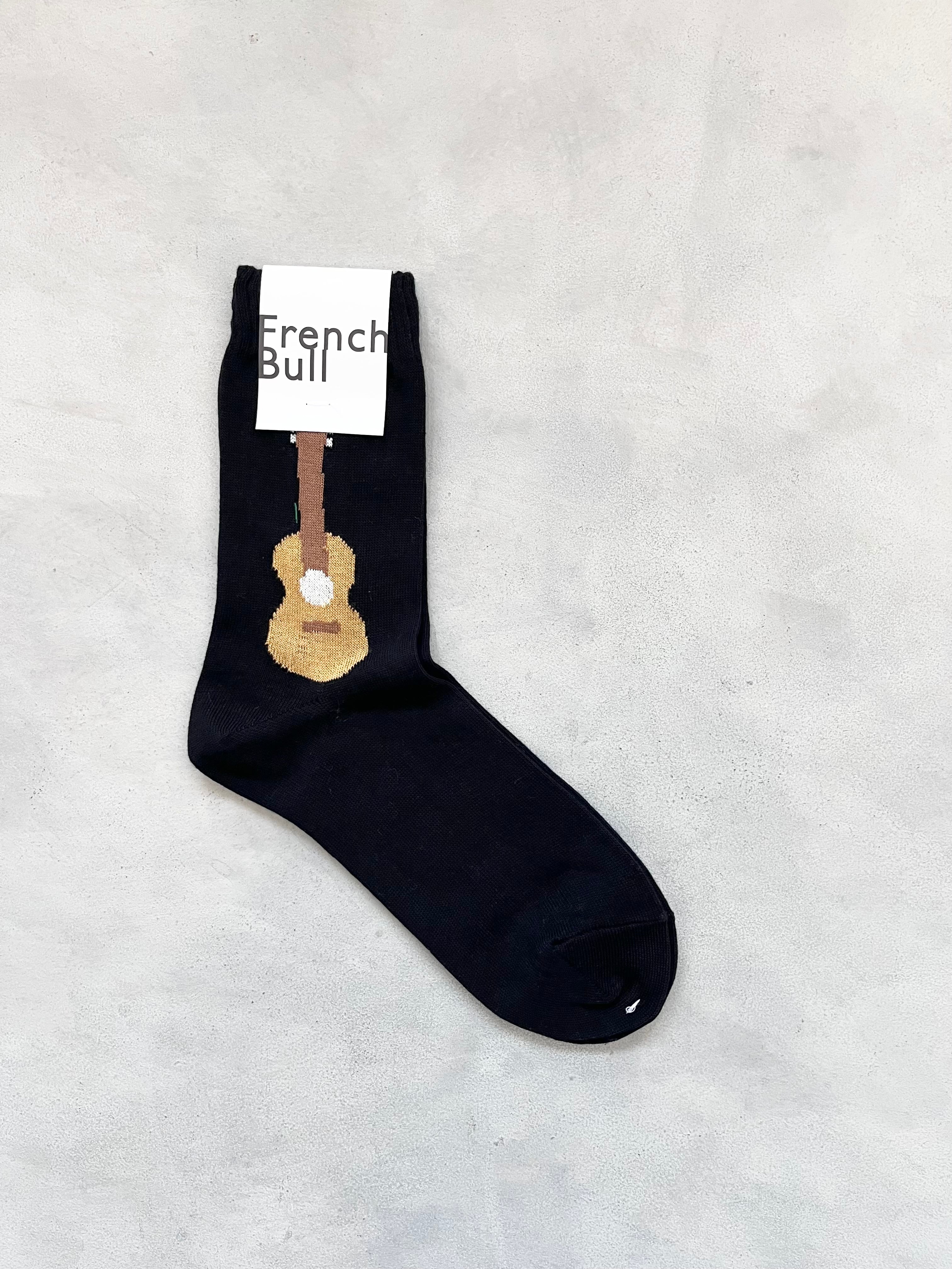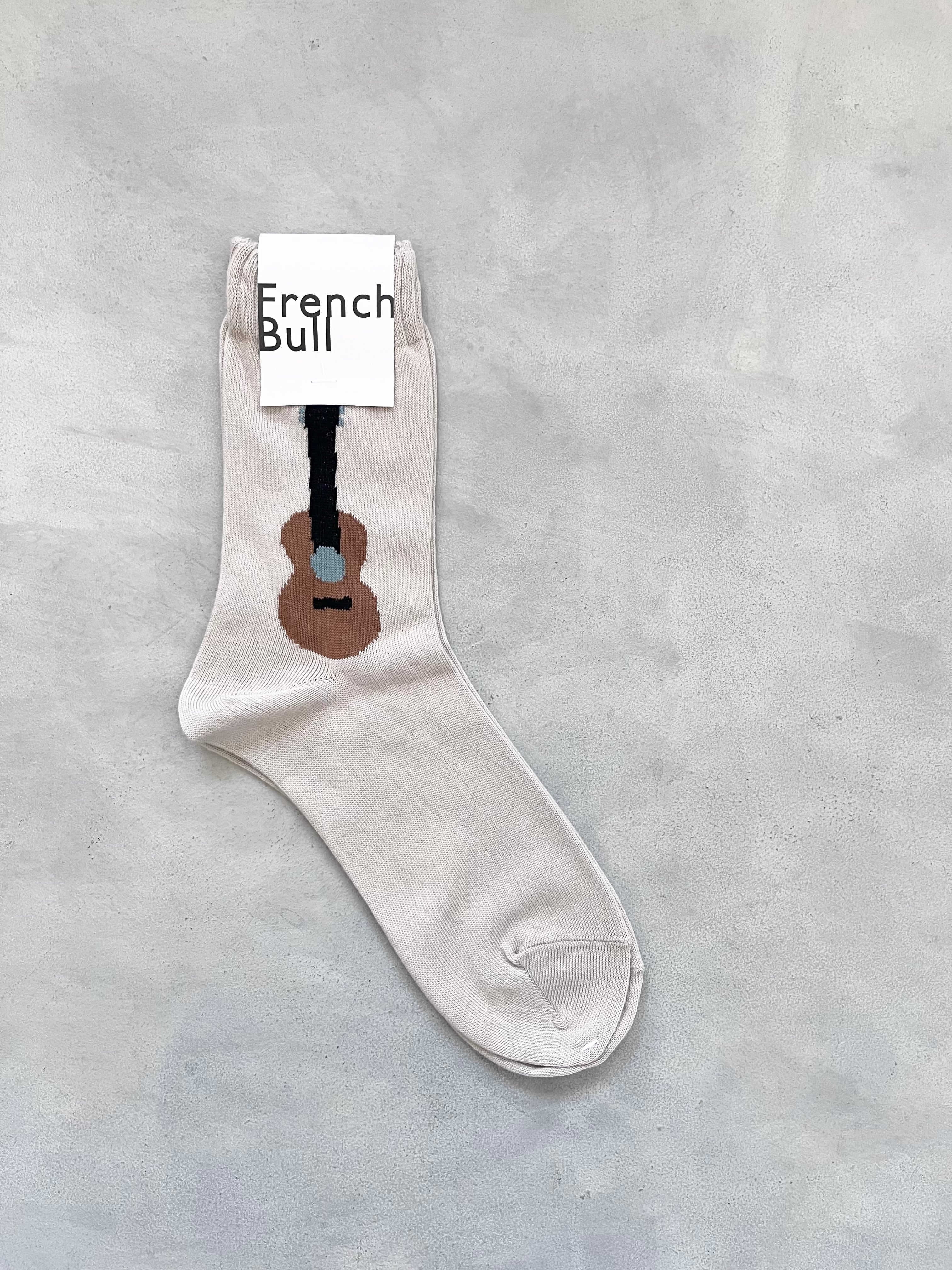 アコースティックギターの柄と反対側には"guitar"のロゴ。 履くと左右で柄が変わる楽しいソックスです。 天然有機系デオドラント加工を施した綿コーマ糸にゆるい弾性糸を入れて編み立て、くたっとしたナチュラルな風合いに仕上げました。 ポップなデザインと配色でコーディネートのポイントになること間違いなし! 程よい厚みで通年履いていただける1足です。 素材:綿77% ナイロン23% サイズ:23cm~25cm 履き口からかかと20㎝