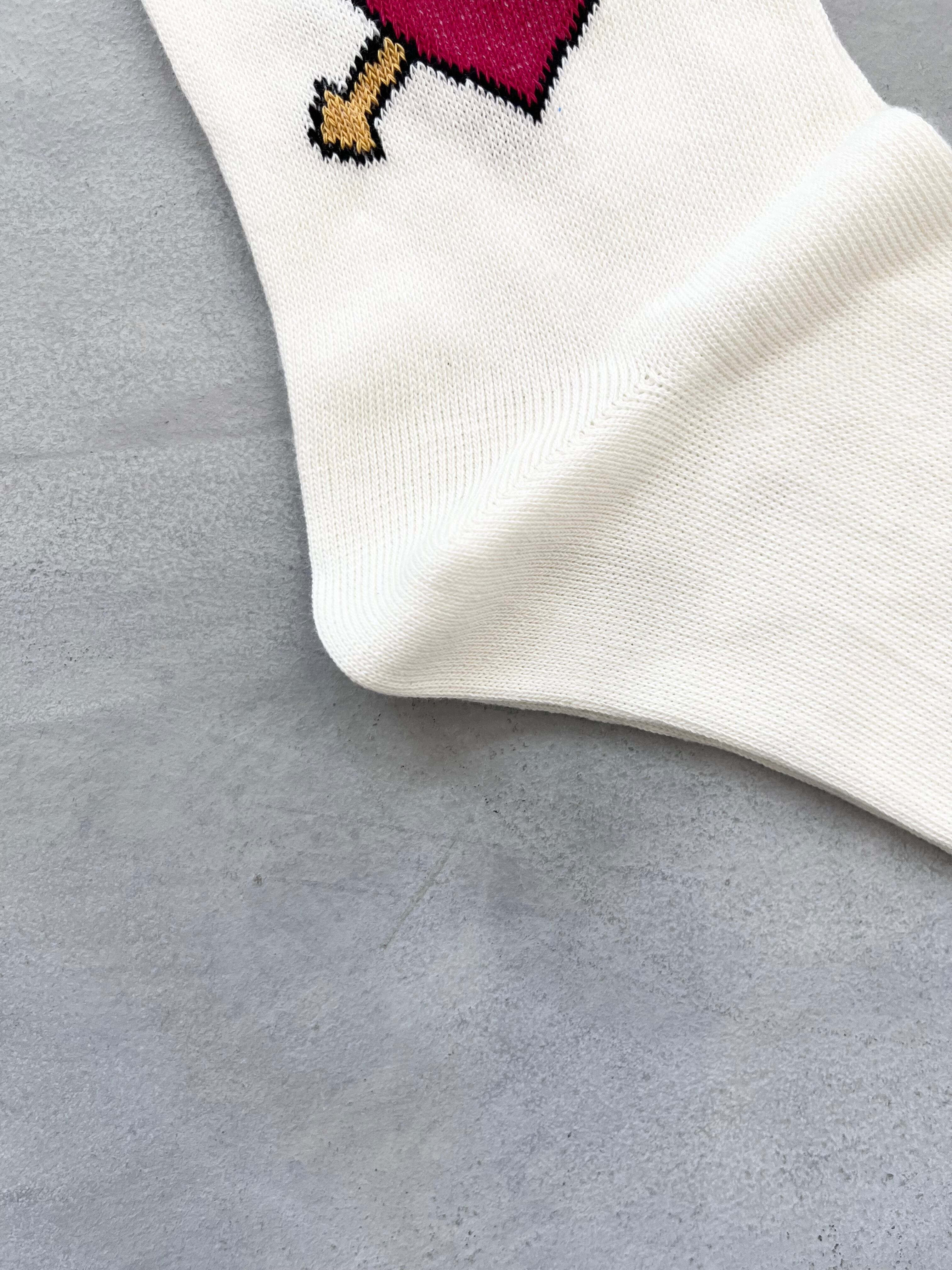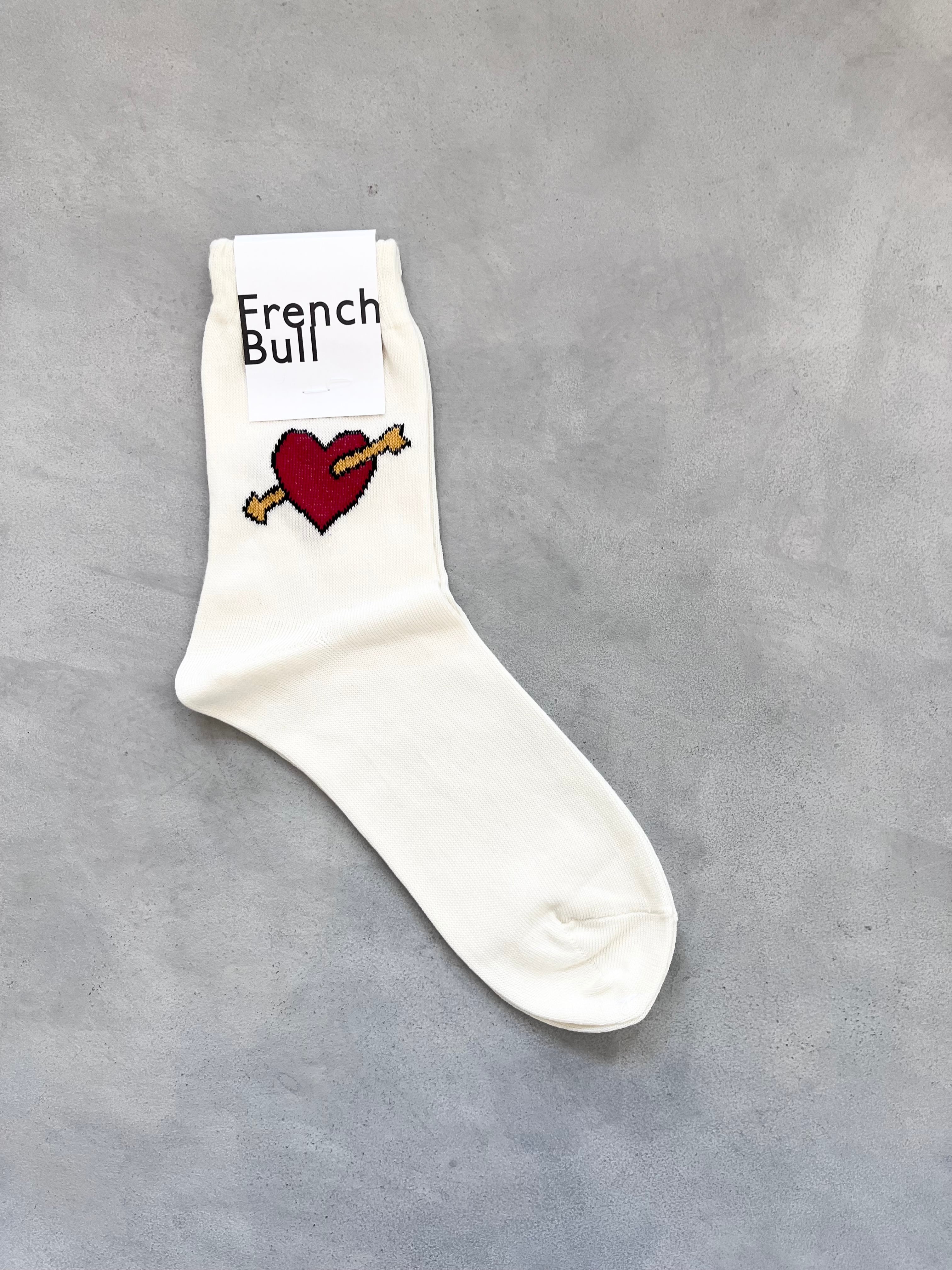 シンプルなハート柄と、反対側は矢で撃ち抜かれたハート柄をデザインした、キュートでPOPな雰囲気のハートソックス。 オーガニックコットン糸にゆるい弾性糸を入れて編み立て、くたっとしたナチュラルな風合いに仕上げました。程よい厚みで通年履いていただけます。 視線を集めるPOPなハート柄は、コーディネートのアクセントに。 ふと目に入るたび幸せな気分になれそうな1足です。 素材:綿78% ナイロン22%(オーガニックコットン使用) サイズ: 23cm~25cm 履き口からかかと18cm