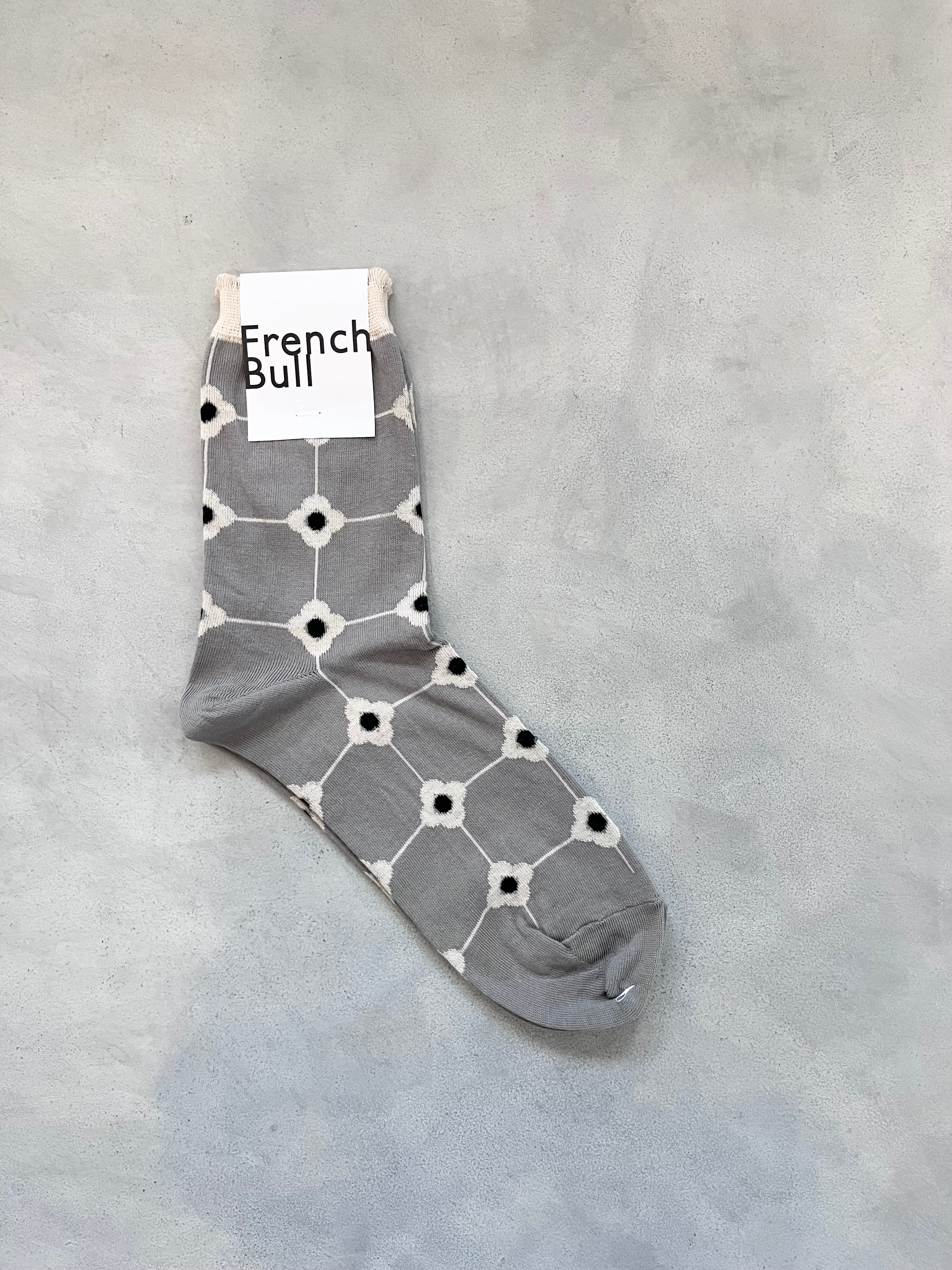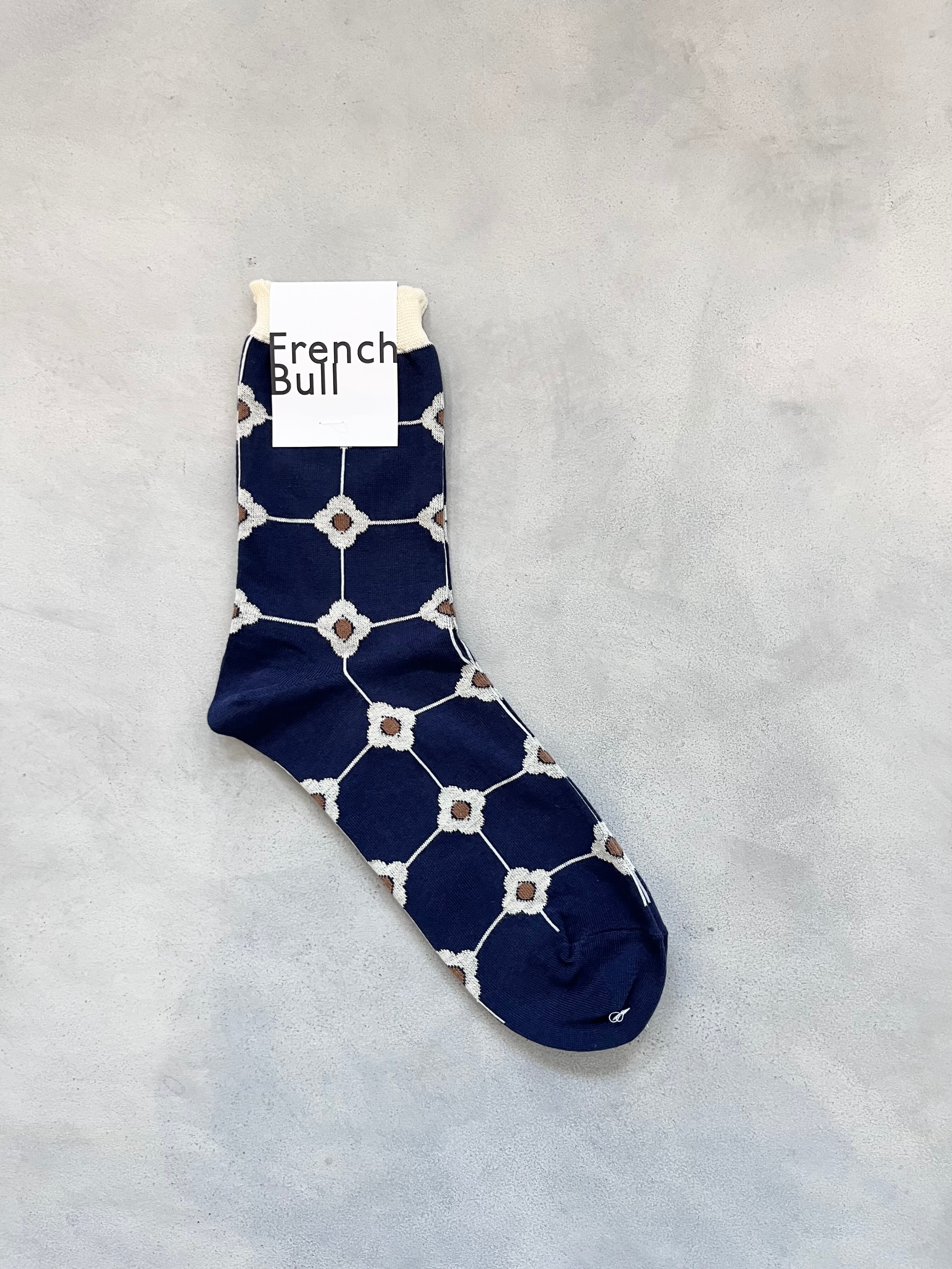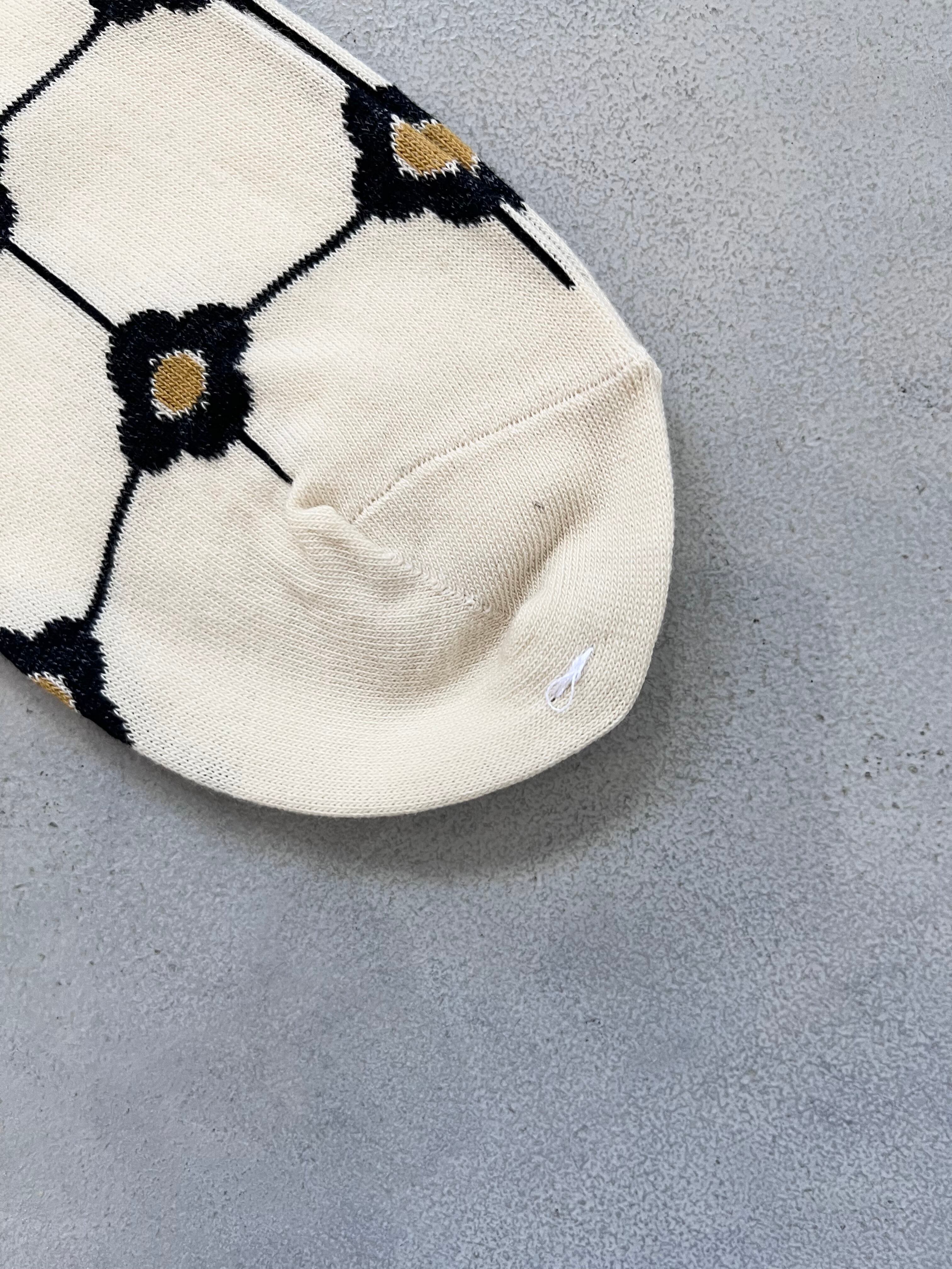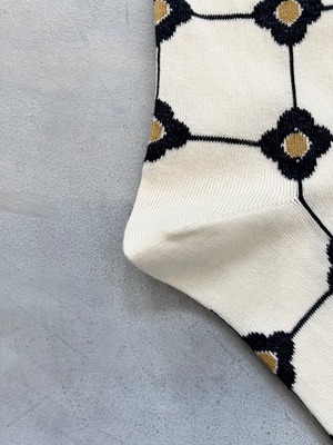 レトロなタイルをイメージした柄のソックスです。 上品な華やかさのあるデザインで目をひく魅力的な1足♩ 柔らかな綿糸で薄く編み立てました。 程よい薄さなので、快適な履き心地です。 落ち着いた配色で、いろいろなスタイリングに合わせやすいソックスです。 素材:綿62% ナイロン38% サイズ:23cm~25cm 履き口からかかと21cm