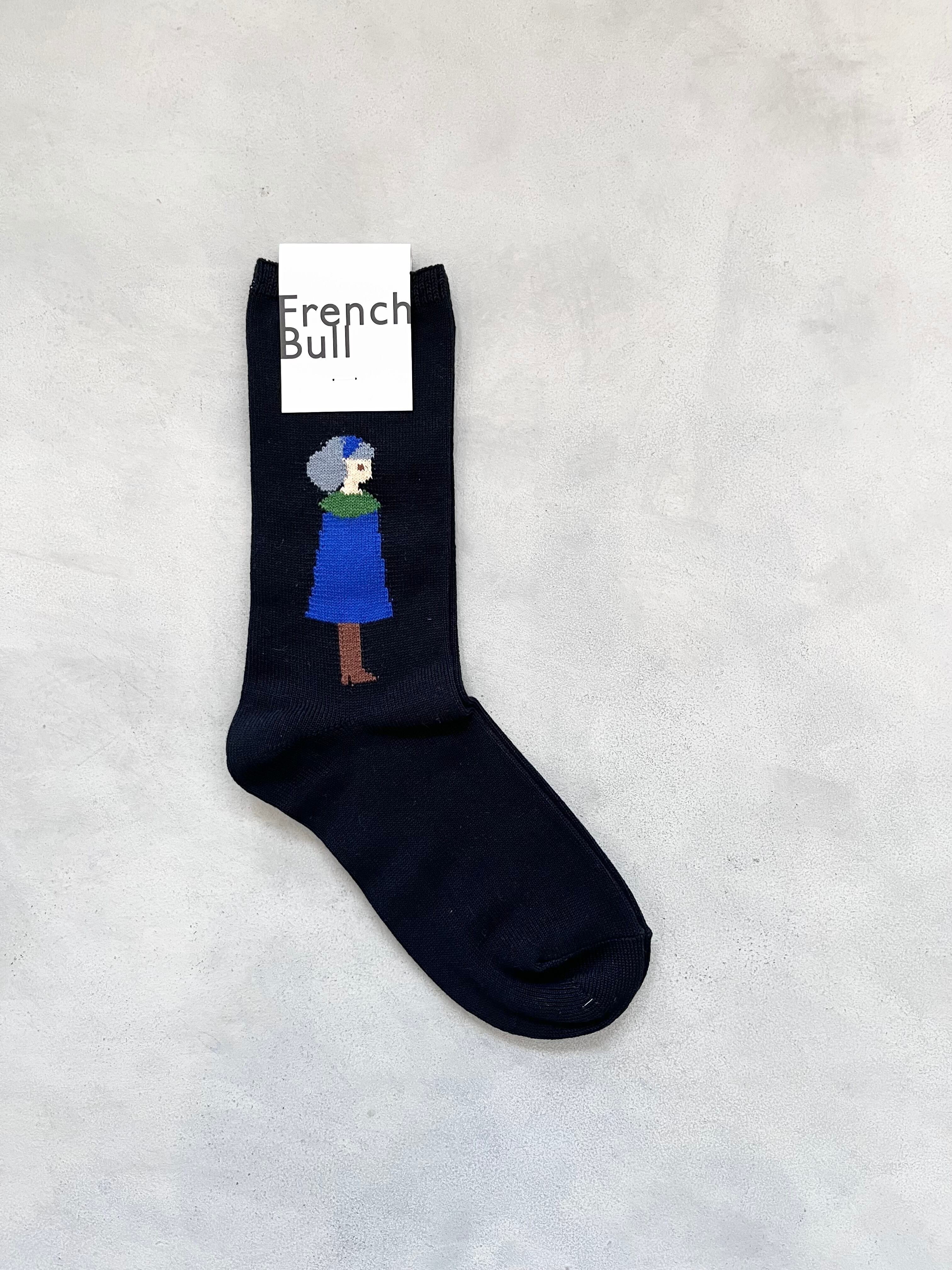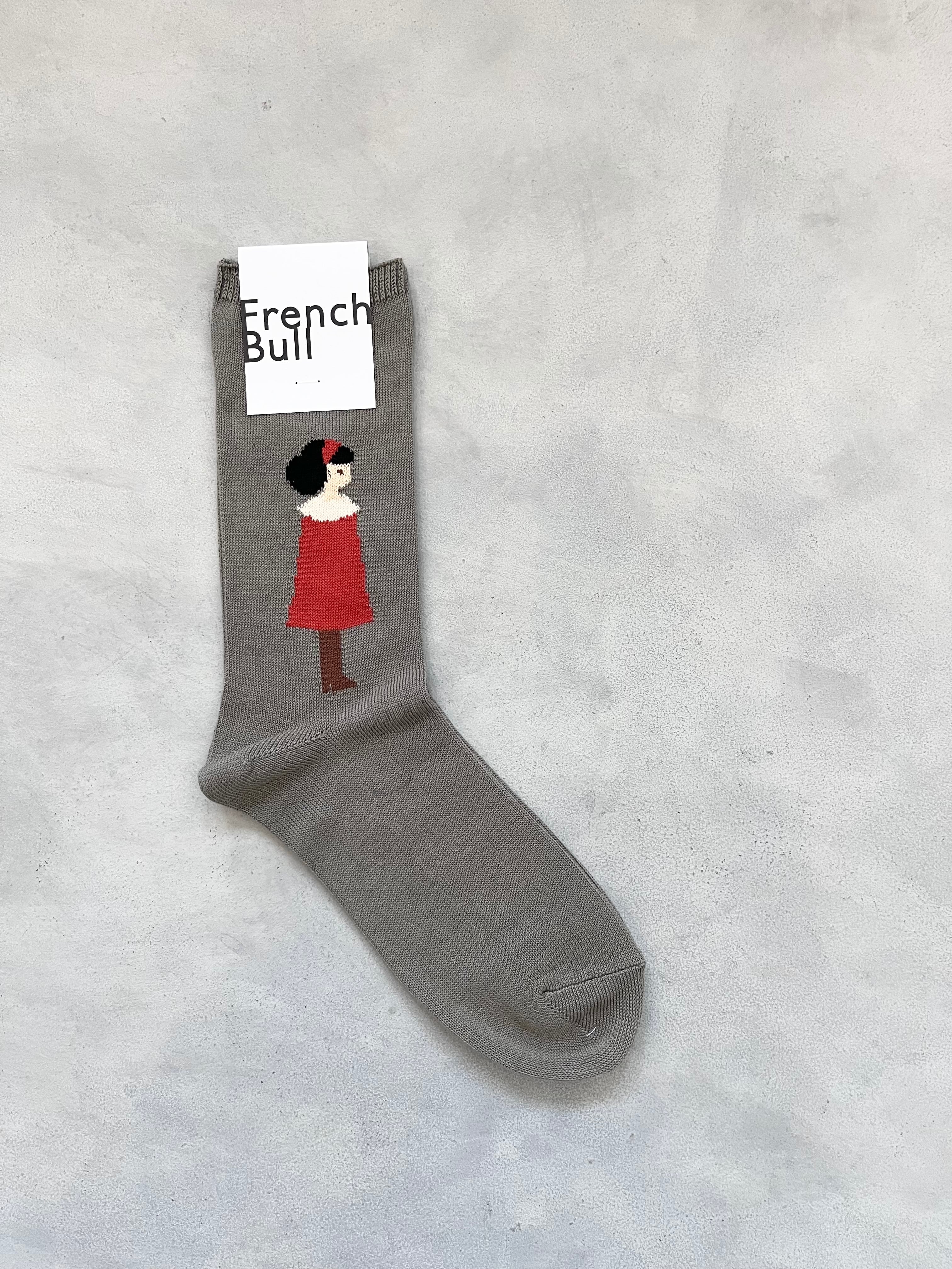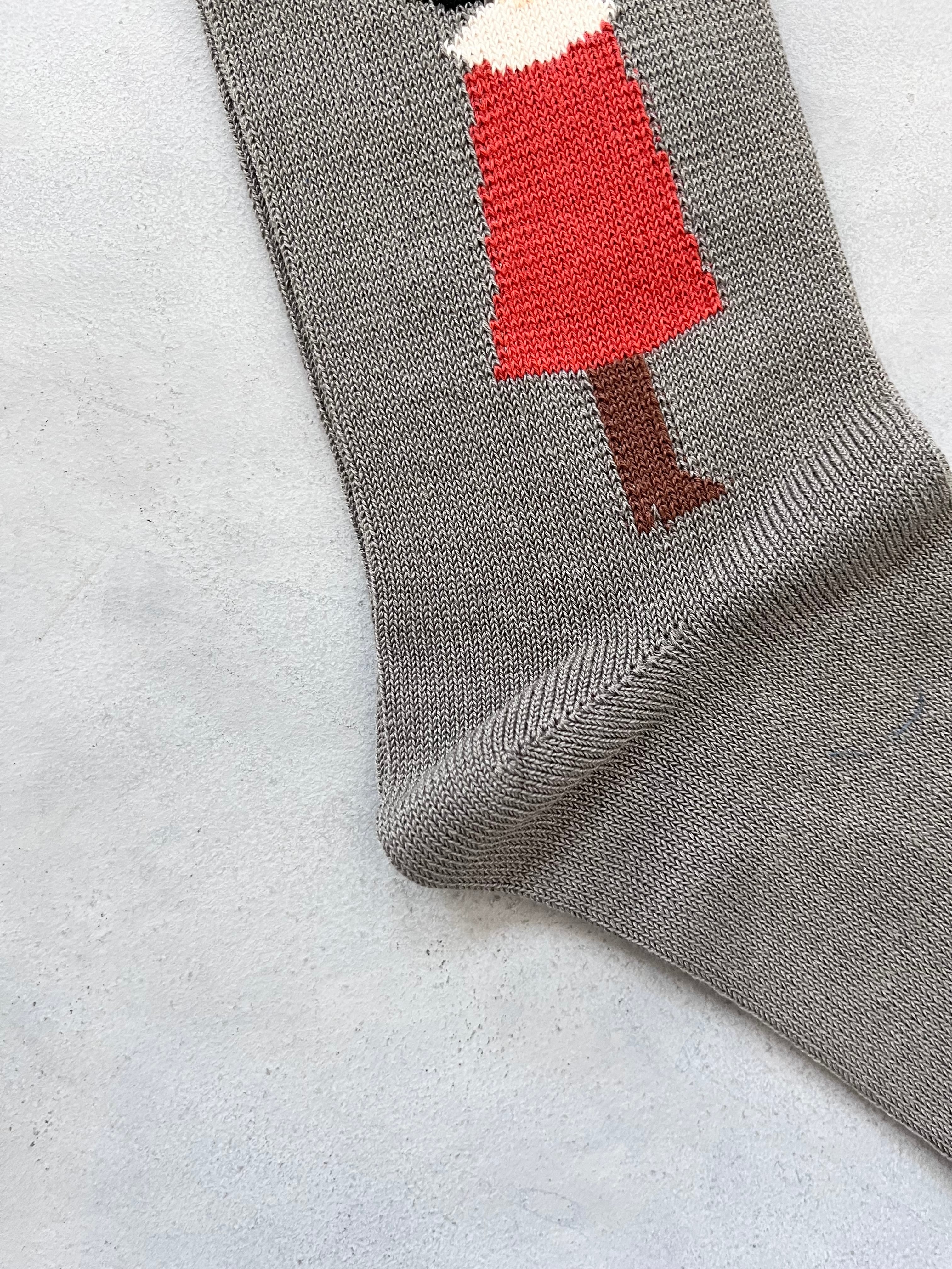 キュートなカップルが描かれた遊び心くすぐるソックス。 左右で柄が異なるのもポイント◎ シルケット加工を施した毛羽が少なく、光沢感のある綿糸を使用しました。 程よい厚みに編み立てているため、快適な履き心地。 見ても履いても気分があがる1足です◎ 素材:綿84% ナイロン14% ポリウレタン1% レーヨン1% サイズ:23cm~25cm 履き口からかかと23cm
