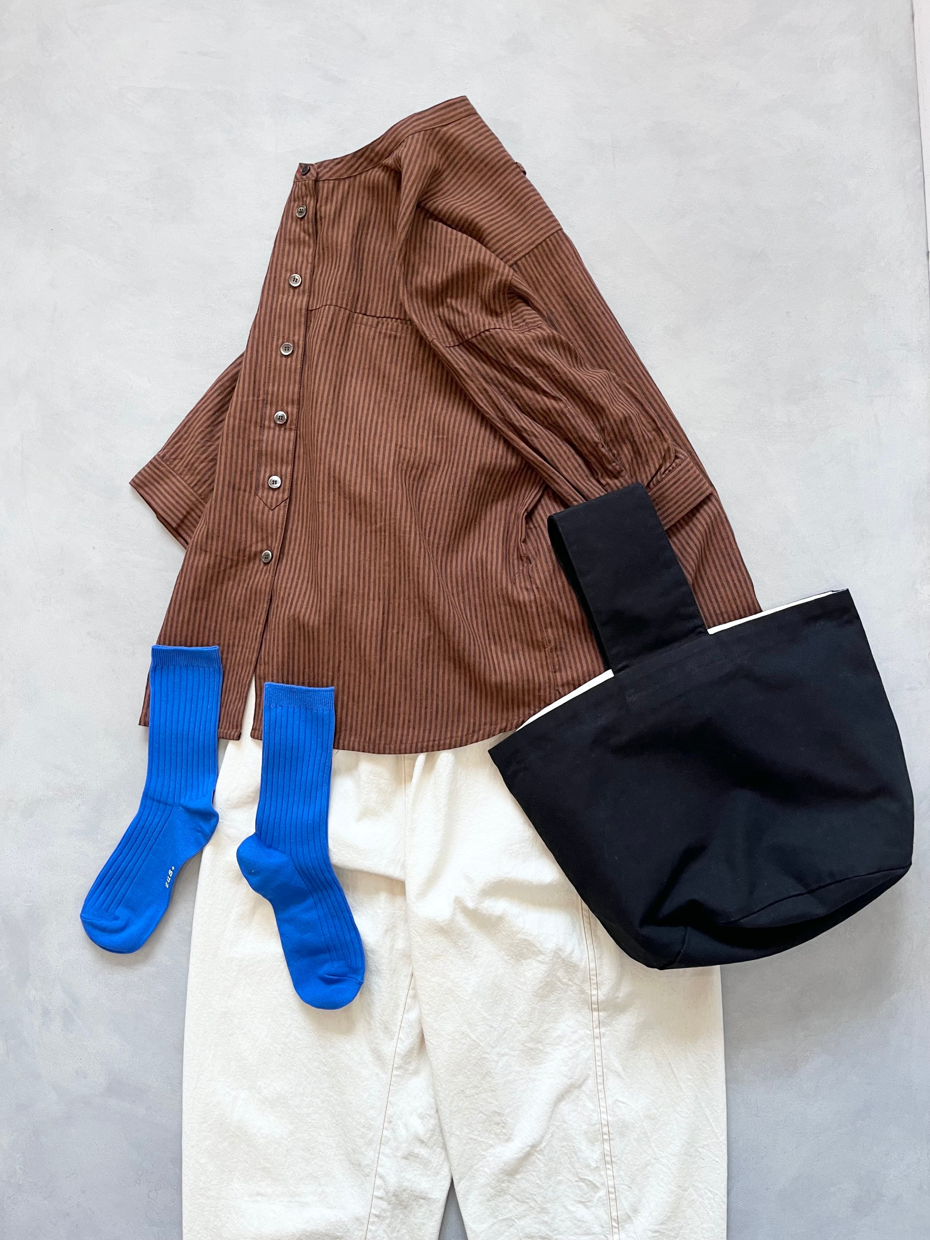 首元はすっきりとしたバンドカラーでカジュアルながらも落ち着いた印象に◎