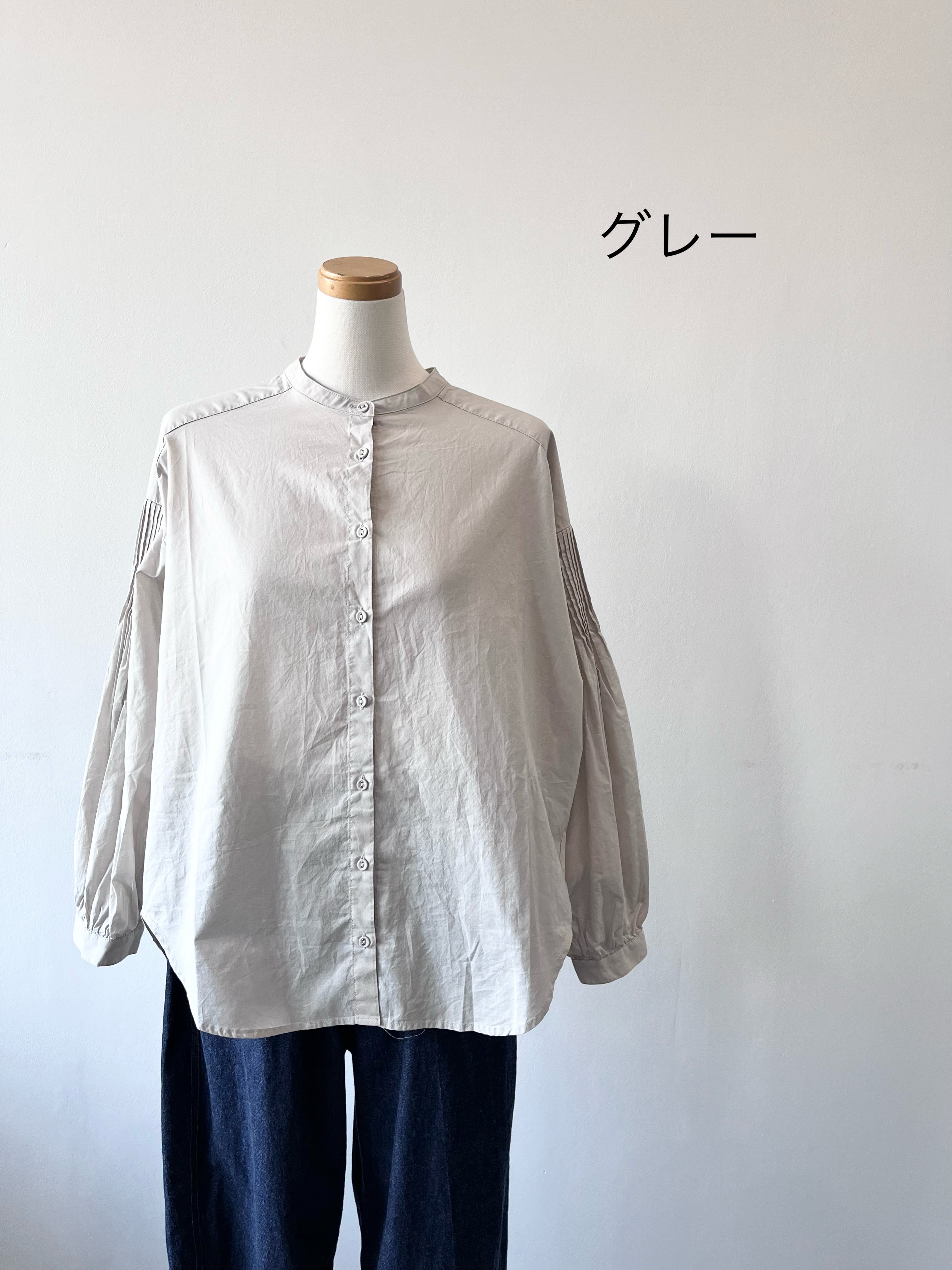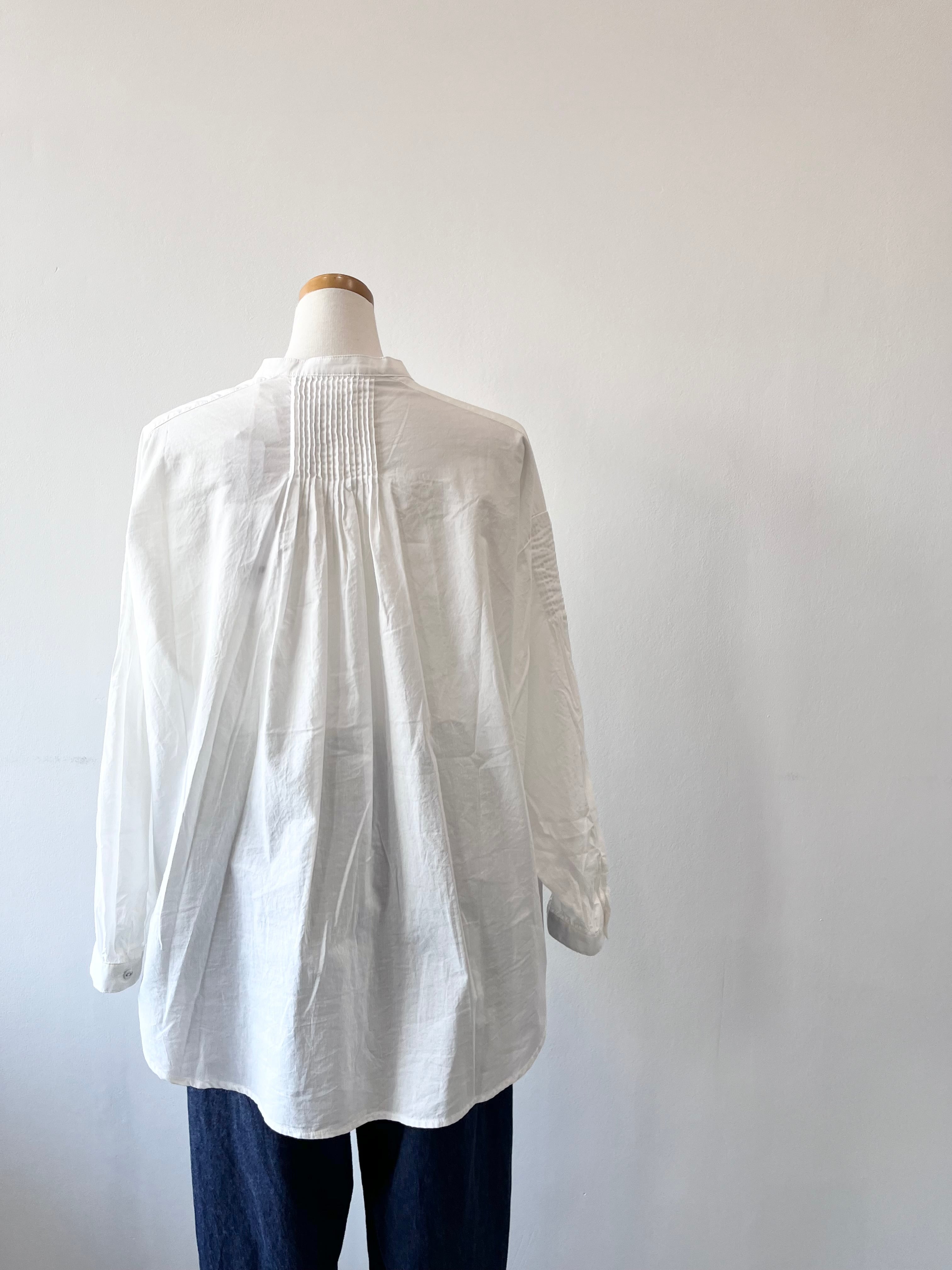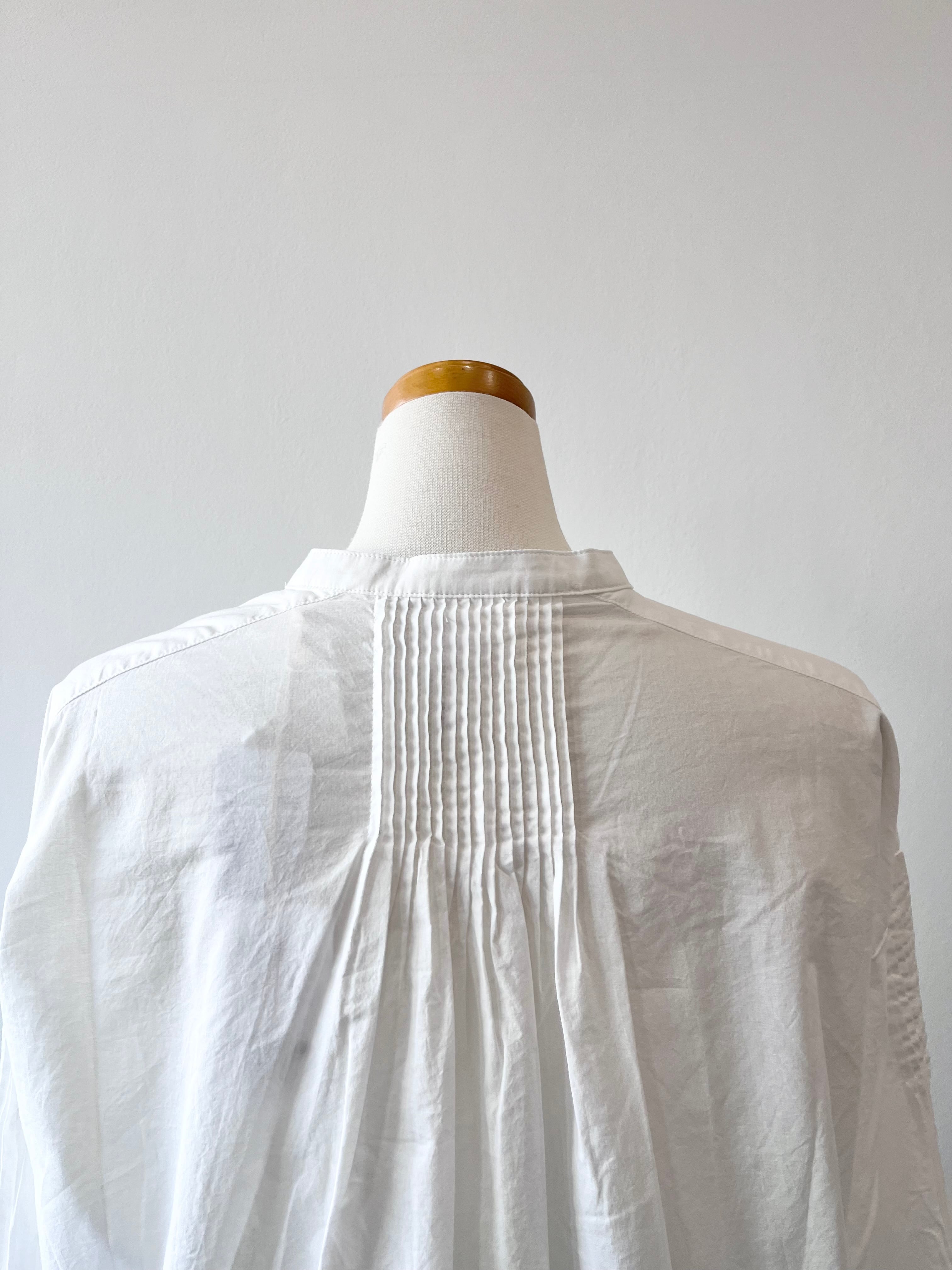 柔らかくて軽いコットンローン生地を使用したシャツ。 袖とバックスタイルの繊細なピンタックが特徴的な一枚で、一枚着でパンツやスカートに合わせるだけでも上品な着こなしに◎ 裾に前後差があり、お尻がすっぽり隠れる丈感で気になる部分をカバーしてくれるのも嬉しいポイントの一枚です。 素材:綿100% サイズ:73cm 身幅68cm 肩幅55cm 袖丈48cm