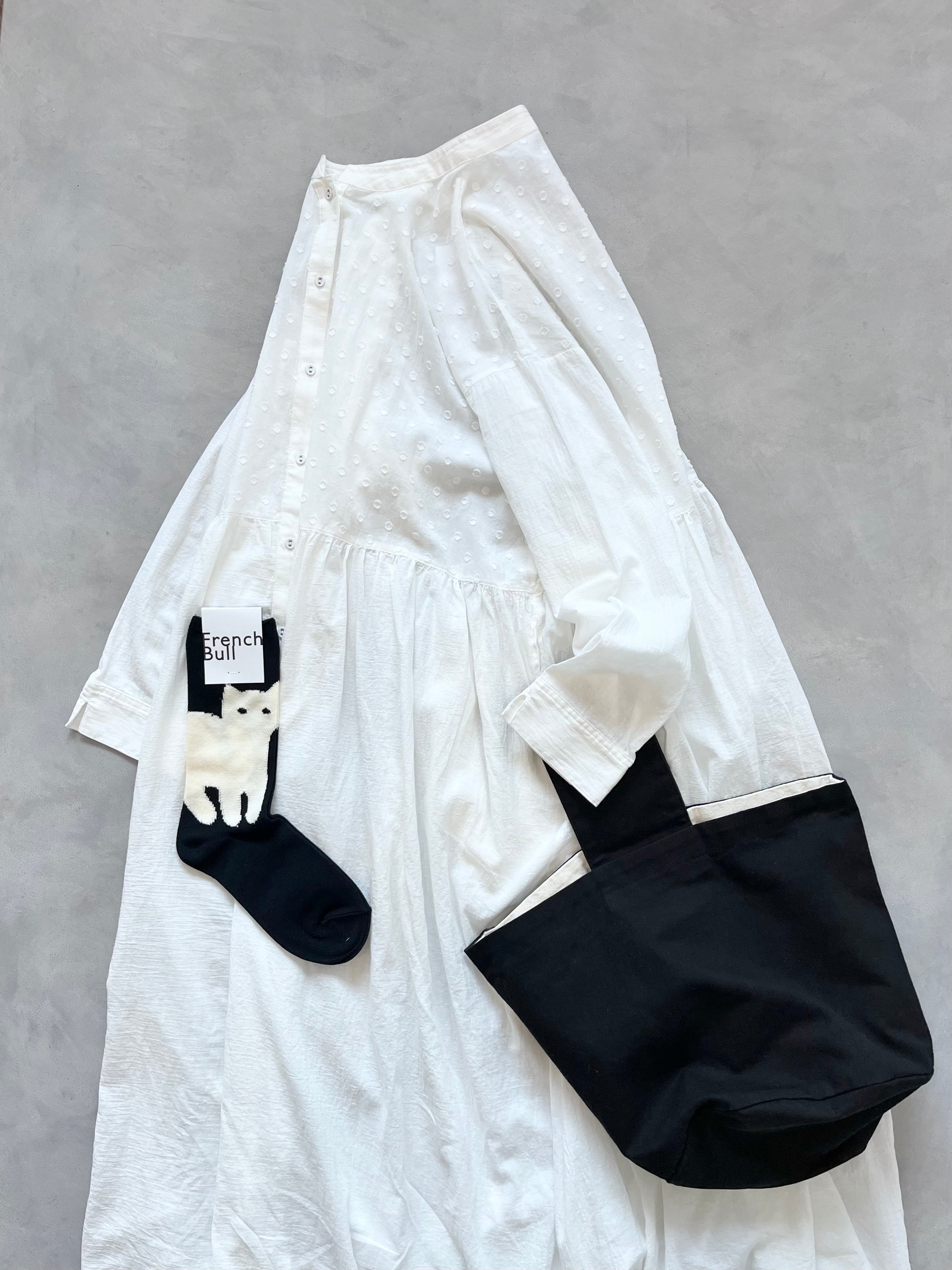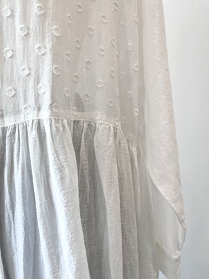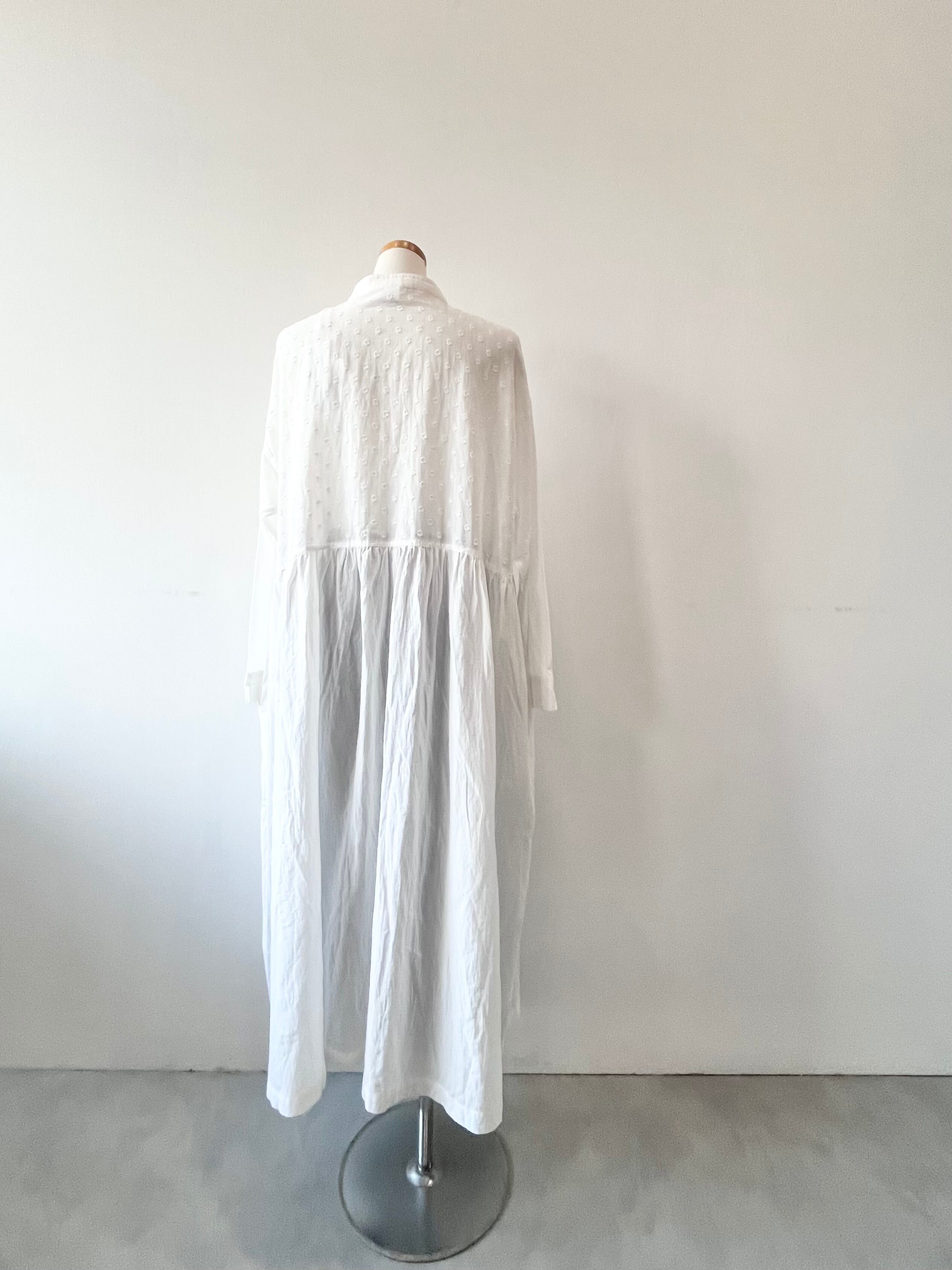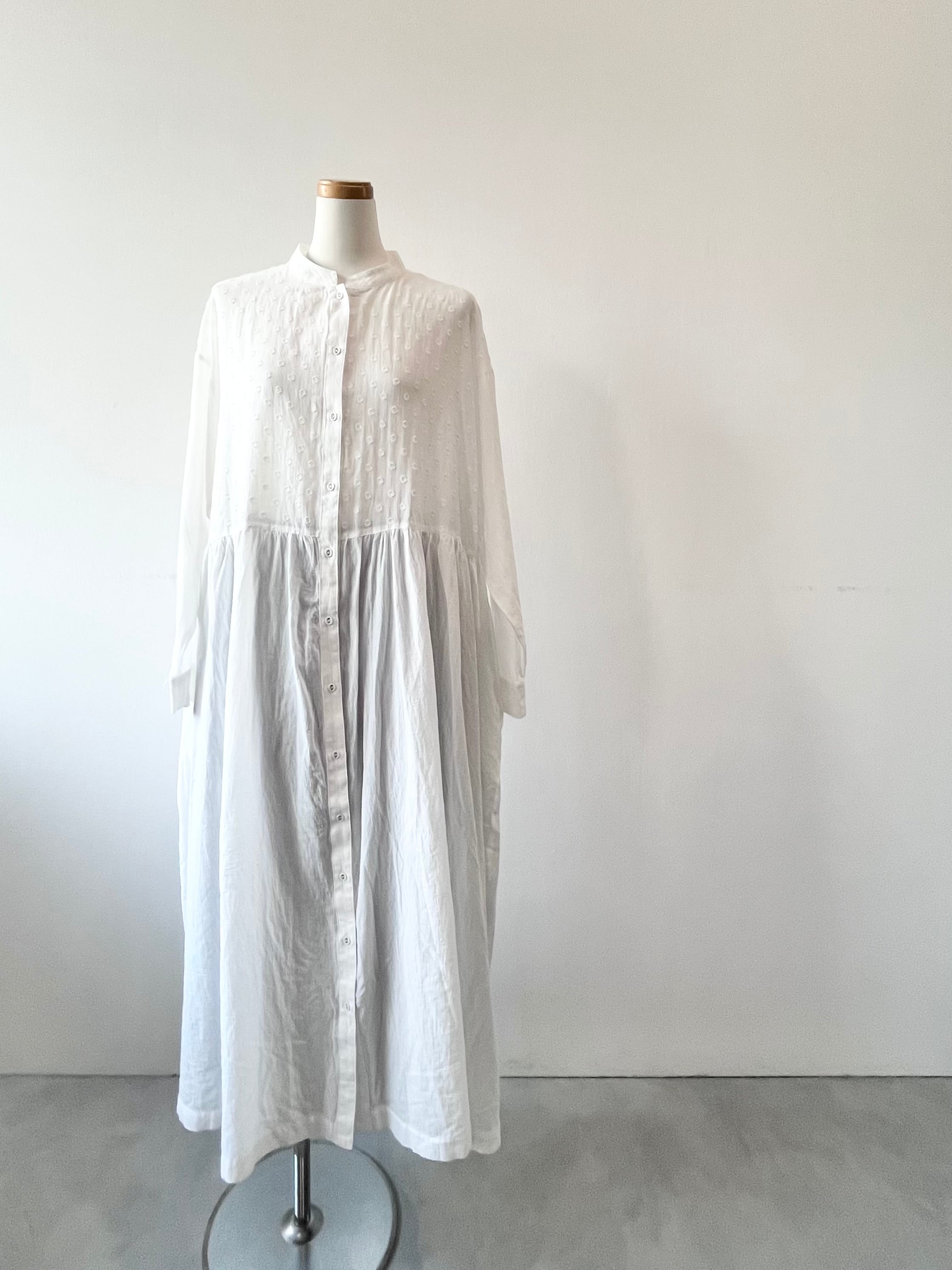 自然なシワ感のあるナチュラルな雰囲気のコットンローン生地と異素材のドビードットを切り替えたワンピースです。